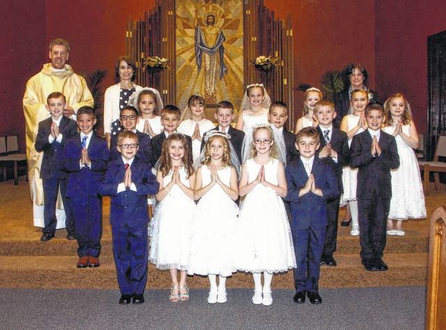 Children who received at the noon mass, in alphabetical order in photo one, are: Alexis Angelovic, David Colburn, Gianna DeCesaris, Alexander DeRolf-Siene, Allison Desciak, Christopher Flanagan, Patrick Flanagan, Fiona J ohnson-Fallon, Carter Guido, Gierria Kirkutis, William McCabe, Brady McCann, Caitlin Mizzer, Keegan Mulcahy, Emma Murphy, Kevin Osipower, Joshua Phillips, Connor Pribula, Lauren Roberts, Brooke Radginski, Tyler Sassi, Adelynn Sromovski, Haylie Symeon, Luke Tellis, Alexa Thompson, Abigail Worth and David Worth. Other participants include Rev. James J. Paisley, pastor; Mrs. Denise Williams, coordinator of religious education; Mary Dougherty, teacher; Parker DalSanto, youth aide. Photo 2, from the 9 a.m. mass, alphabetically, are: Nicholas Bednar, Brooke Bisulca, Noah Corcoran, Joshua Covert, Brianna Falcone, Dallas Fernandes, Noah Fetko, Jenna Krispin, Charles Medico, Ella Plummer, Lily Ratchford, Savannah Remus, Sophia Roman, Ainsley Slacktish, Gavin Smigielski, Vincenzo Sparacio, Chase Waligun, Owen Wielgosz and Sabrina Zdancewicz. Other participants: Rev. James J. Paisley, pastor; Mrs. Denise Williams, coordinator of religious education; Mrs. Beverly Harostock, teacher. Photo 3, from the 11 a.m. mass, alphabetically: Elijah Badami, Contessa Ciarimboli, Gracie Coyne, Bodhi Cronin, Finn Cronin, Kate Dautrich, Ava Knorr, Brandon Miller, River Morgan, Cecilia Nguyen, Menyn Novicki, Regan Quinn, Sadie Quinn, Ryan Roman, Francisco Santana, Angelina Saracino, Michael Scanlon, Alex Smith, Juliana Tosi, Tyler Valenti, Layla Williams and Grace Wolfe. Other participants: Rev. James J. Paisley, pastor; Deacon Raymond Lenahan, Mrs. Denise Williams, coordinator of religious education, Mrs. Peggy Harvey, teacher, and Mrs. Elizabeth Serbin, teacher aide.