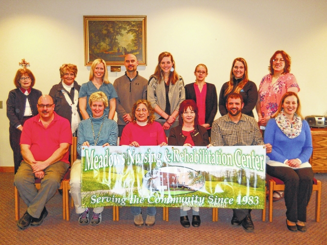 The Meadows Nursing and Rehabilitation Center along with Cura Hospitality, LLC, will be hosting a Health and Wellness Fair on 10 a.m. to 1 p.m. Thursday, April 21. First row, from left, Arnie Black, Dining Services Director, Cura Hospitality, LLC; Crista Zern, Select Medical Rehab; Debbie Klapat, Cross Valley Chiropractic; Brenda Balinski, Meadows Director of Nursing; Paul Onzik, Associated Family Home Care; Rebecca Sims, Clinical Dietitian, Cura Hospitality, LLC. Second row, Judith Johnston, Family Hearing Center; Louise C. Ligi, Colbert and Grebas; Karla Dalessandro, RN, Personal Care Home Health; Dr. Mark Morris, Chiropractic and Rehab Associates; Alyssa Stencavage, Home Instead Senior Care; Dr. Melissa McPartland, Cross Valley Chiropractic; Cristina Tarbox, Meadows Administrator.