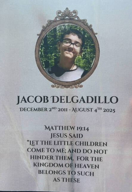 This memorial card for 13-year-old Butler Township murder victim Jacob Delgadillo was distributed at his funeral on Tuesday.