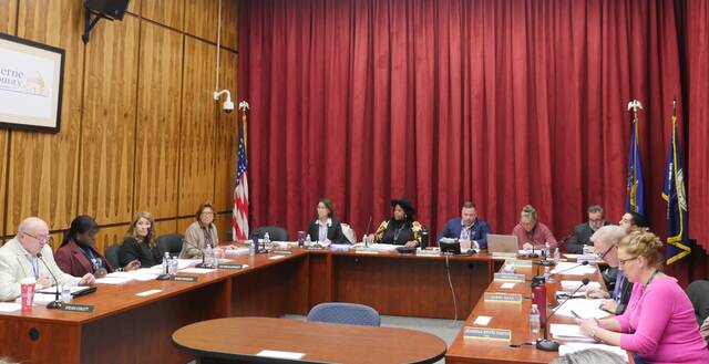 Luzerne County Councilwoman Denise Williams reads a resolution during Tuesday’s meeting. Also shown, from left, are Council Vice Chairwoman Brittany Stephenson, Chairman Jimmy Sabatino, Councilman Harry Haas and Councilwoman Joanna Bryn Smith.