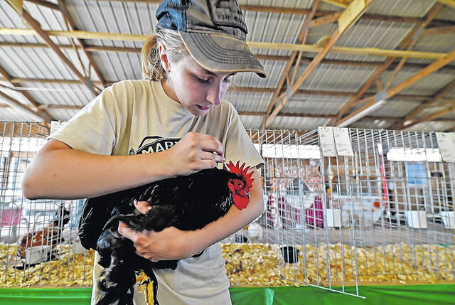 Julie Cilvik of Benton gussies up her Black Bantam Cochin before the opening of the 2019 Luzerne County Fair. The fair’s 2021 run kicked off Wednesday and continues through Sunday.