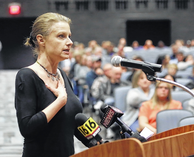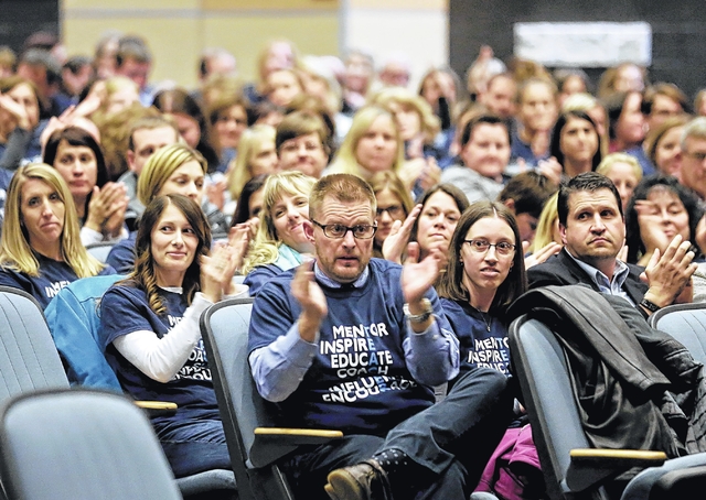 All 179 of the district’s teachers attended the meeting, which was held in the high school’s Performing Arts Center. As they entered en masse, some members of the audience applauded.