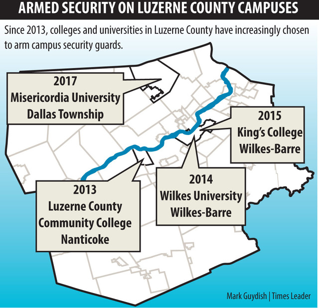 Armed guards have been on local campuses since 2013, when Luzerne County Community College announced some guards on the Nanticoke campus would start carrying firearms. Wilkes University followed suit in 2014, and King’s College announced the addition of guns to the security force in 2015.