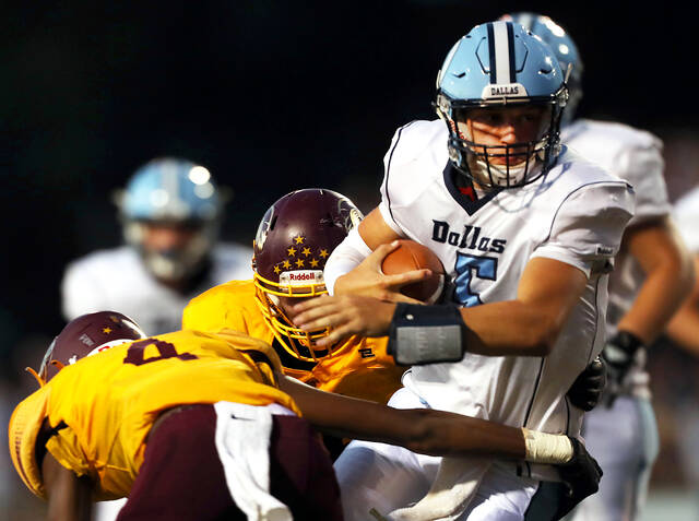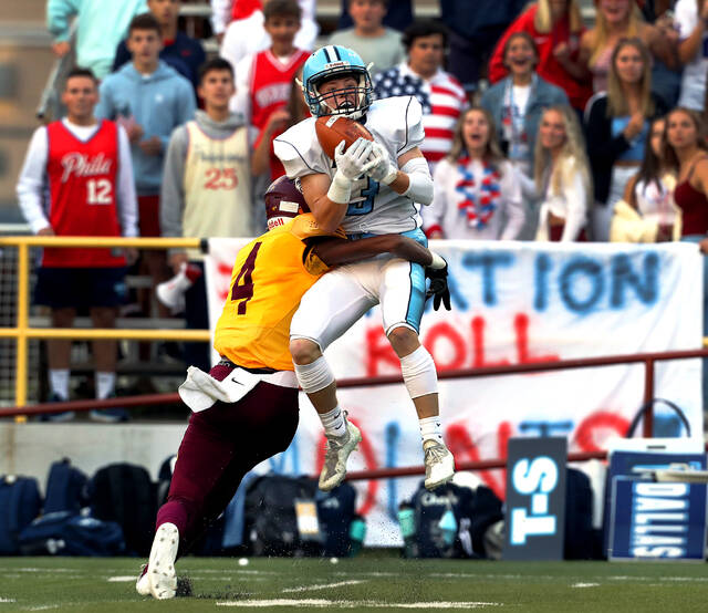 Dallas wide receiver Joe Peters pulls in a pass in front of Wyoming Valley West defensive back Hunter Pries in the second quarter Friday night.