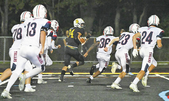 Lake-Lehman’s Jaydon Skipalis (34) runs away from a crowd of Nanticoke Area defenders on his way to a 39-yard touchdown on Friday night.