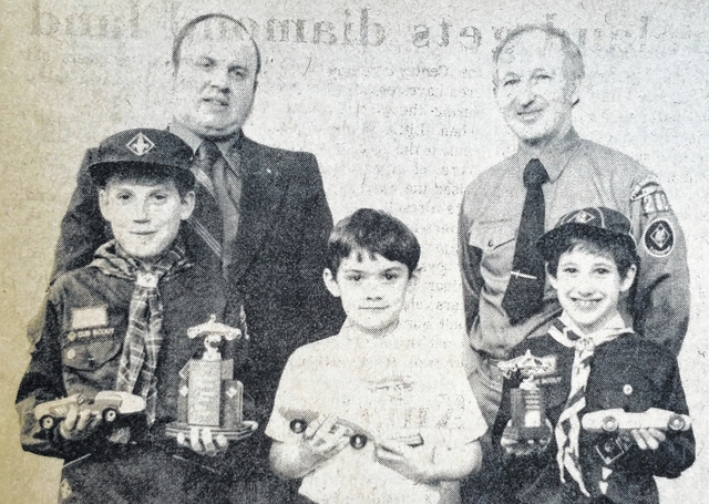 Gate of Heaven Church hosted a Pinewood Derby in March 1975. From left, first row, David Kubasti, first place; John Ferrarra, second place; and Bobby Cartier, third place. Second row, Holy Name Society President William Tabor and Scout Leader Robert Cartier.