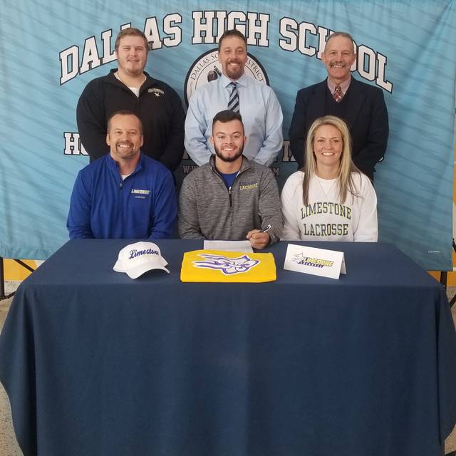 Dallas High School senior Michael Starbuck signed a National Letter of Intent to play lacrosse for Limestone College. The Limestone Saints are a 5x Division II National Championship program in South Carolina. Starbuck is a standout player in both lacrosse and football, receiving multiple MVP and All-Star awards. He holds a 3.9 GPA and intends to study Pre-Professional Biology. Starbuck verbally committed to Limestone following a visit last summer. Starbuck has one more season at Dallas and will play at Limestone for the 2021 season. From left, first row, are Scott Starbuck, father; Michael Starbuck, Lori Starbuck, mother. Second row, John Zug, head lacrosse coach, Dallas High School; Michael Richards athletic director, Dallas School District; and Rich Manello, head football coach, Dallas High School.