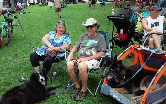 Bringing a bicycle cart for their dogs Jayne and Sheba to lie on, Bradley Gleason and his wife Jennifer came to the festival from Bath, NY for the fourth time. They heard about the event from an ad at Music in the Park in Hammondsport, NY.